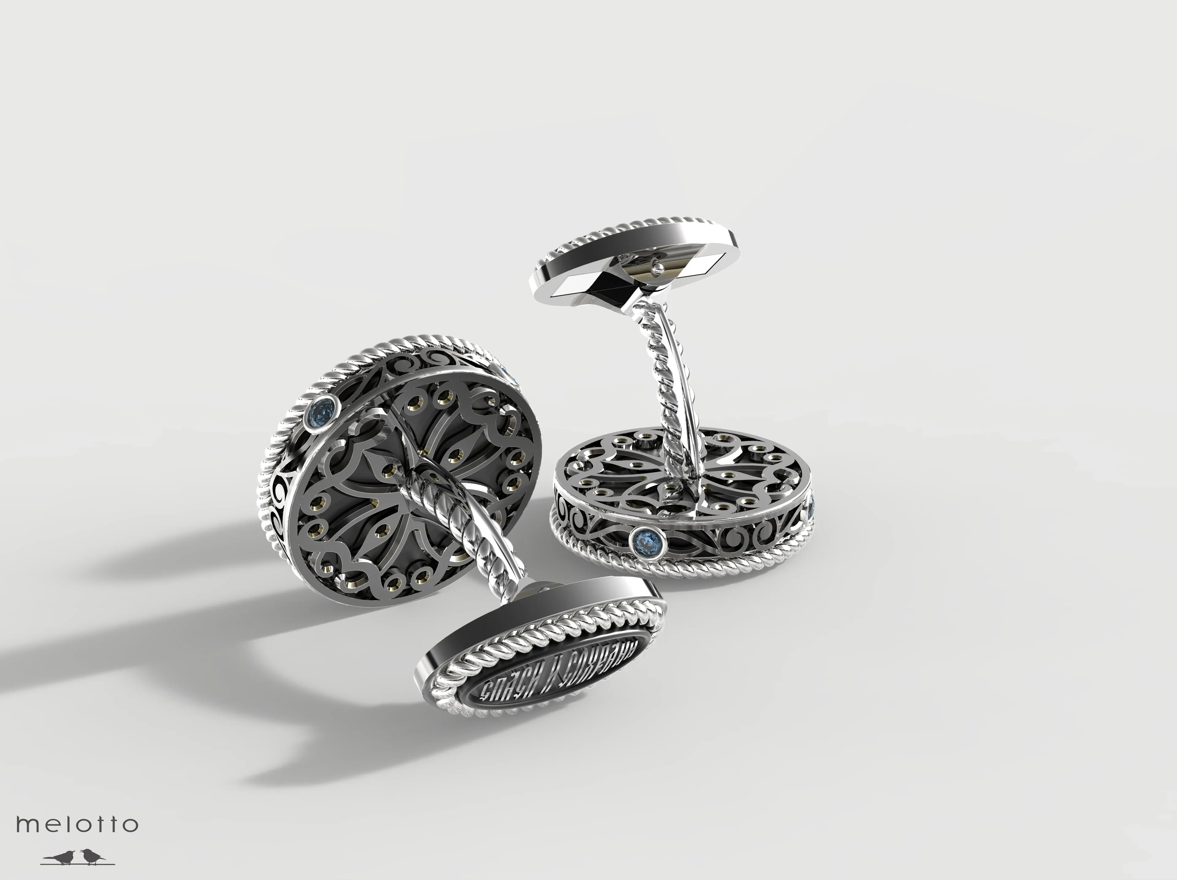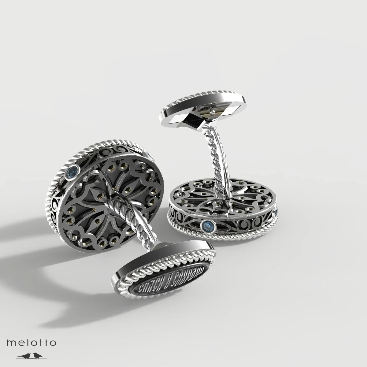 Запонки с черным агатом, изготовлены на заказ и покрыты устойчивым родиевым покрытием для защиты поверхности на долгие годы., золото 585 пробы, размер 16.0 мм., вес 16,0 гр., 8 сапфиров общим весом 0.18 карата.Изготовление с Вашими инициалами от 7 до 20 дней.Поделиться